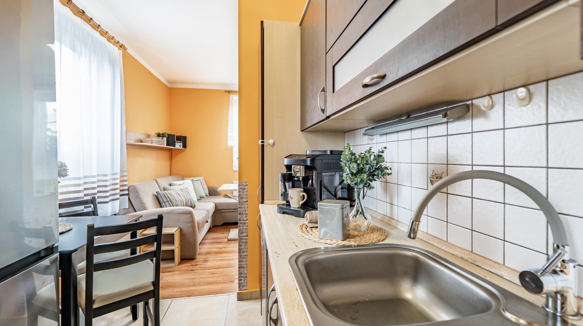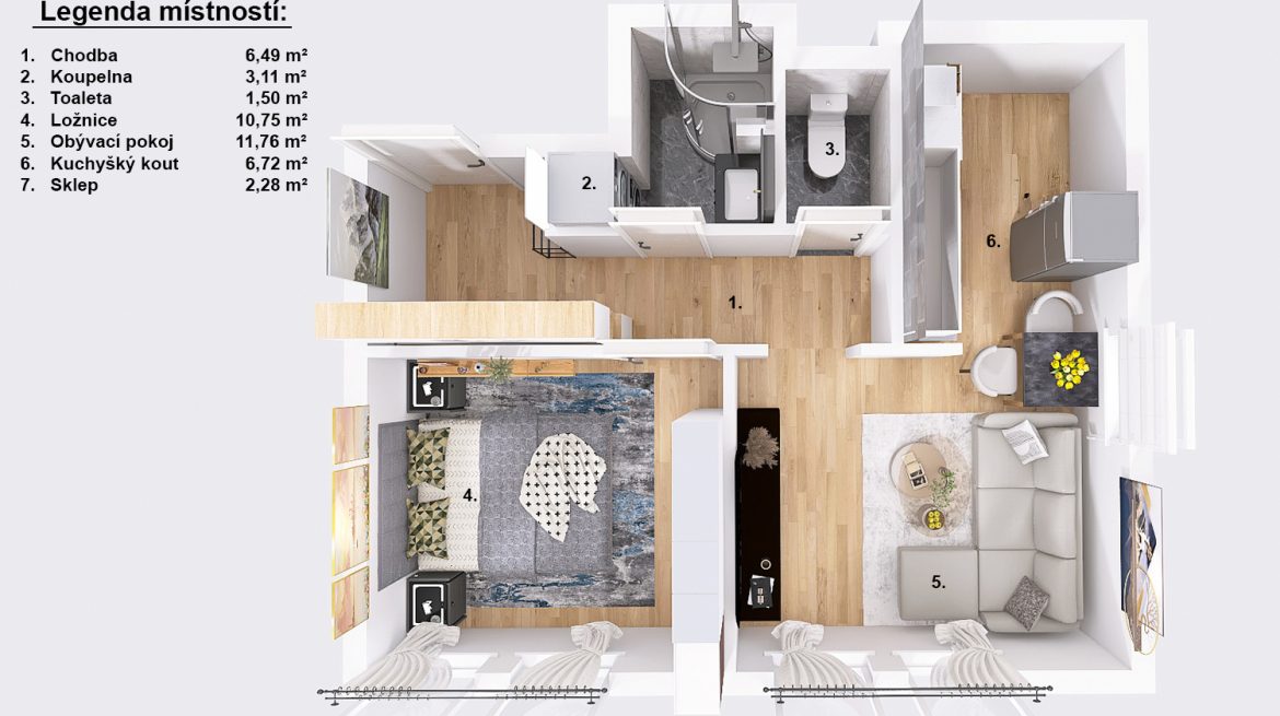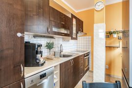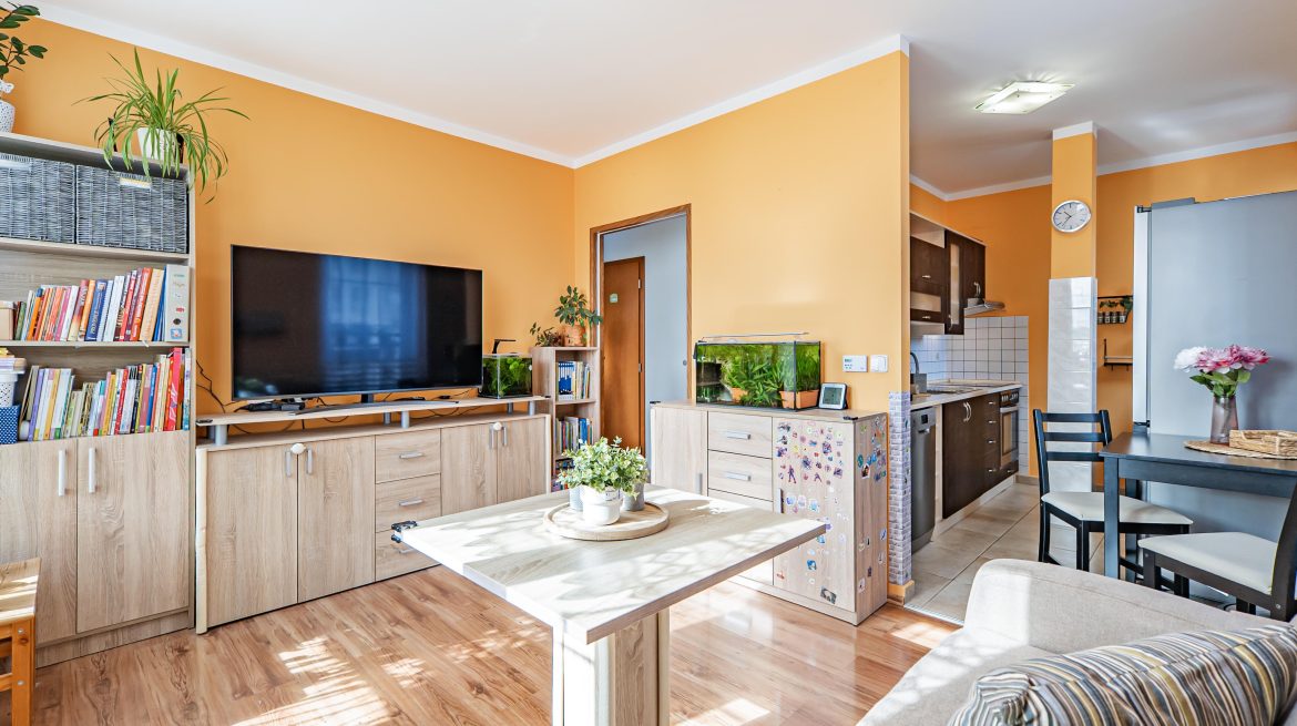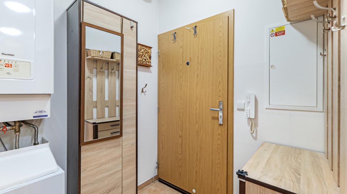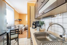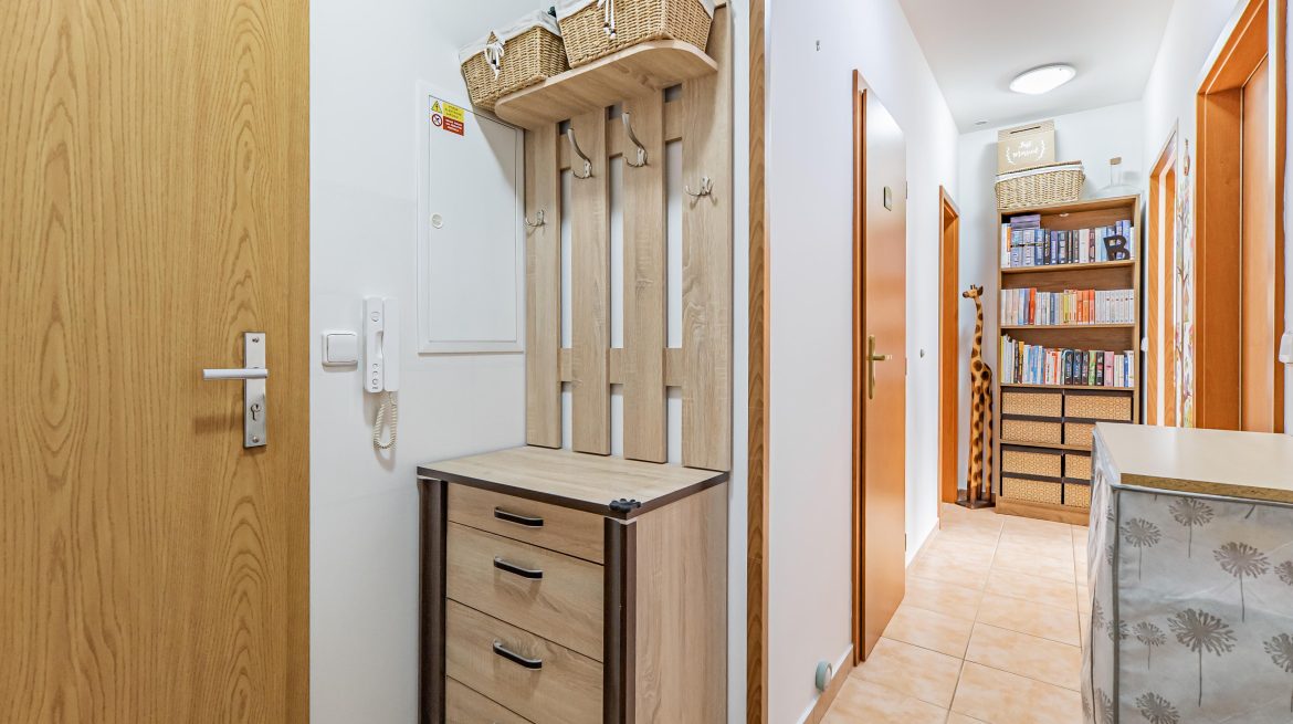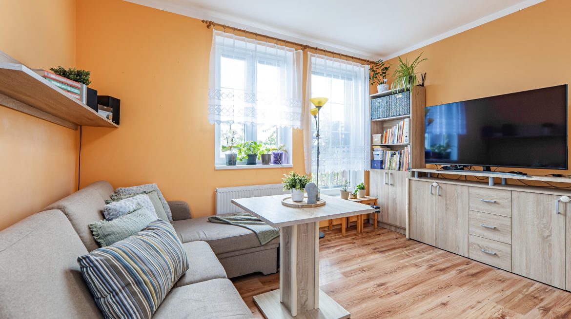 It is ideal starter housing for a single person, couple, or young family. It is also a great investment opportunity. The apartment is located on the first floor of a revitalized building with an elevator and, thanks to its perfect condition, is ready for immediate occupancy—or even for renting. It features a living room with a kitchenette (the kitchen faces southeast, the living room faces southeast and northeast), a cozy bedroom (facing southeast), and a bathroom with a shower. A basement storage unit (2.28 m2) provides ample storage space. The dimensions of the individual rooms can be found in the attached floor plan.