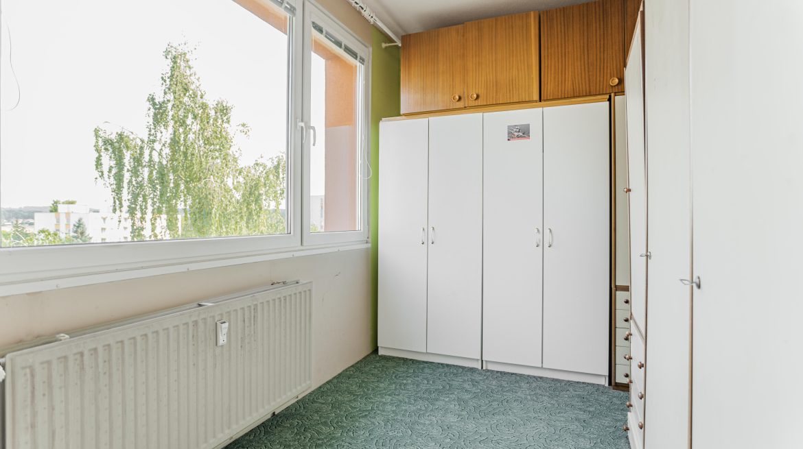 Byt se nachází v pátém patře (šestém nadzemním podlaží) panelového domu s výtahem. Při vstupu do bytu se nacházíme ve větší předsíni (zádveří). Naproti nám je toaleta oddělená od koupelny, V předsíni se dále nachází vestavěná skříň. Z předsíně se můžeme vydat buď do koupelny a dále do kuchyně, naproti které se nachází samostatný pokoj, nebo do obývacího pokoje a odtud dál do dalších dvou ložnic. Jedna disponuje lodžií. K podnájmu náleží ještě zděná sklepní kóje. Byt je orientovaný na jihozápadní stranu.