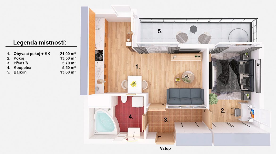 Byt se nachází v pátém nadzemním podlaží bytového domu z roku 2014. Dispozice je praktická, přehledná a ideálně využitelná pro každodenní život. Při vstupu do bytu oceníte velikou předsíň, přičemž po Vaší levici se nachází koupelna s toaletou. Hlavní obytný prostor pak tvoří obývací pokoj s kuchyňským koutem a spolu s tím samostatná ložnice. Součástí bytu je také balkon o opravdu štědré výměře 13,6 m2 a dále sklep (4.5 m2). Veškeré orientační výměry jednotlivých místností jsou k náhledu v přiloženém půdorysu.