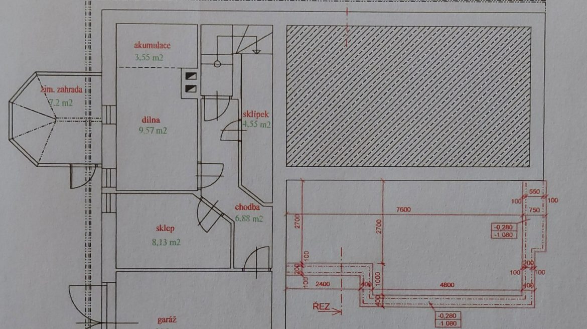 V podsklepené části domu se nachází čtyři místnosti, tj. dva sklepy, dílna a garáž. Na pozemku stojí ještě starší zimní zahrada, ve které si můžete rovněž u roztopených kamen vychutnat dlouhé zimní večery. Doplňkem všeho je dlážděné parkovací stání pro 3 – 4 osobní automobily.