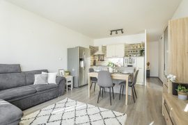 Při vstupu do bytu se nacházíme v chodbě ve tvaru „L“. Po naší levici se nachází oddělená toaleta a koupelna s prostorným sprchovým koutem a dvěma umyvadly. Dále se v nemovitosti nachází 3 obytné místnosti (dvě ložnice a obývací pokoj spojený s kuchyňským koutem). Z jedné ložnice (nyní z dětského pokoje) a z obývacího pokoje se dostanete na svou privátní zahradu. Tu doplňuje schválený smrkový domek, kam může nový majitel uložit zahradní náčiní. Součástí zahrady je i osvětlená modřínová terasa. SVJ schválilo, že si majitelé přízemních bytů mohou na svých zahradách vybudovat pergolu, což bude stvrzeno písemně (nyní se čeká na zpracování zápisu). Na zahradě se nachází i nezámrzný kohout na vodu.