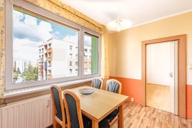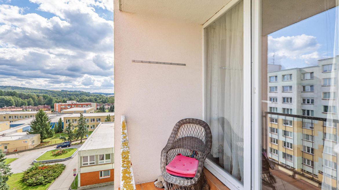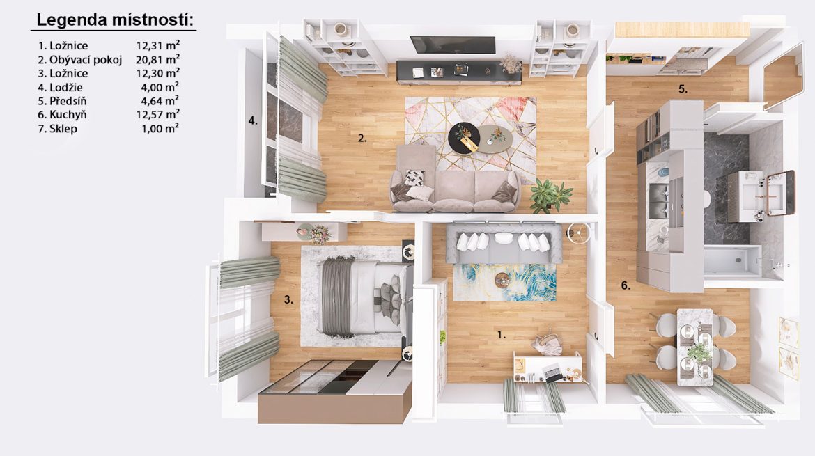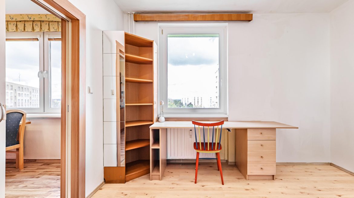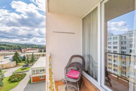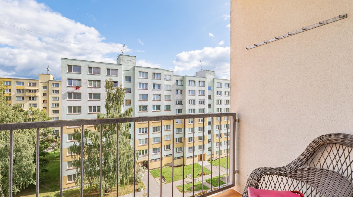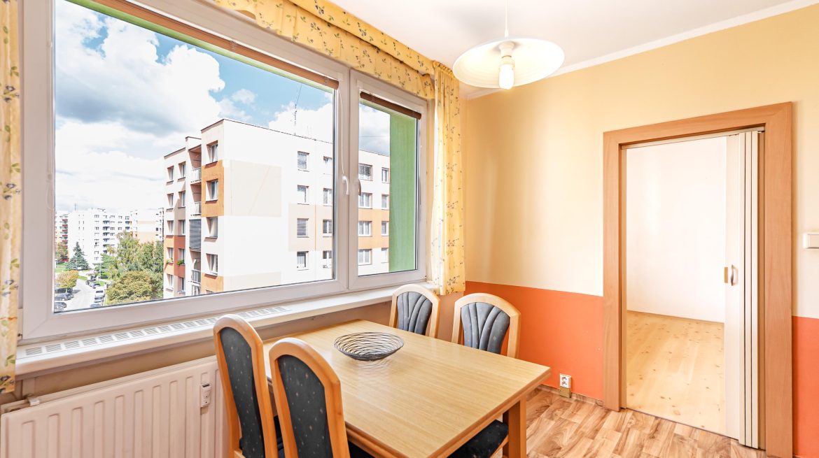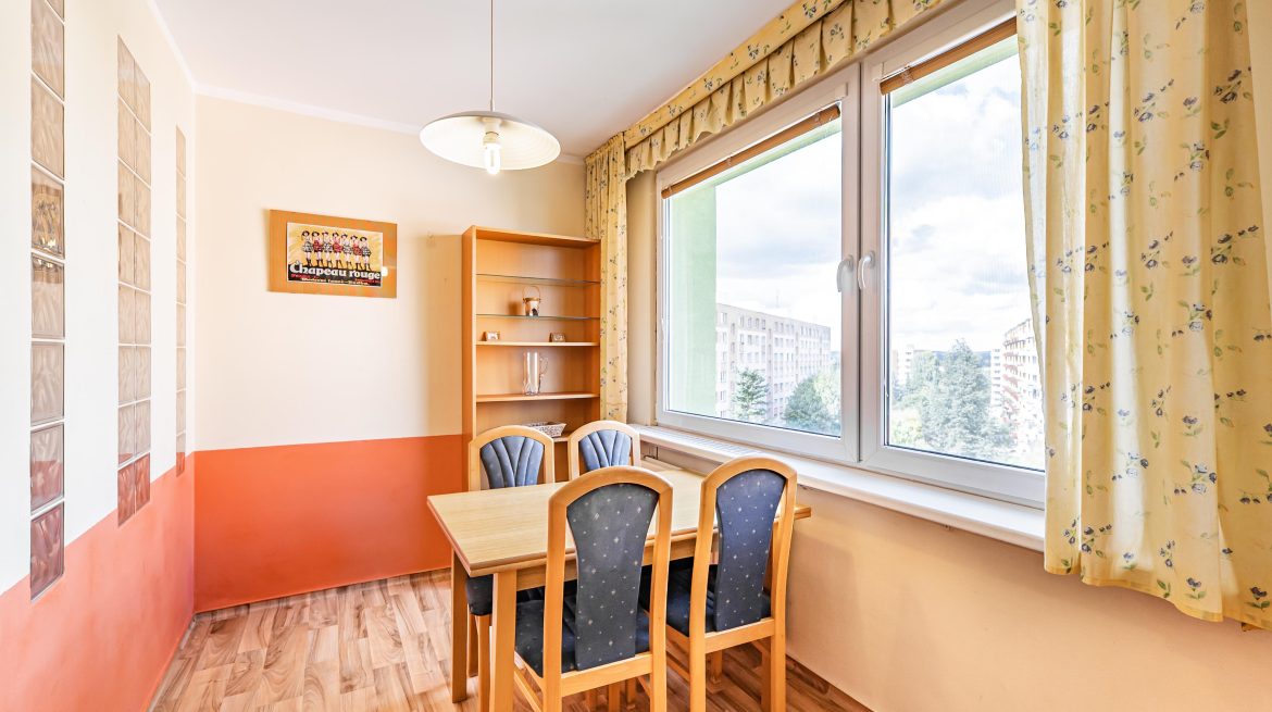 Byt se nachází v šestém patře (sedmém nadzemním podlaží) panelového domu s výtahem. Při vstupu do bytu se nacházíme ve větší předsíni (zádveří). Naproti nám je koupelna s toaletou. Z předsíně se můžeme vydat dále do kuchyně s jídelnou nebo do obývacího pokoje s prostornou lodžií. Díky velkým oknům je tato místnost přirozeně světlá, díky čemuž Vám dodá na pocitu svěžího bydlení. U obývacího pokoje se pak nachází hlavní ložnice. Druhý pokoj, který můžete využít jako další ložnici, pracovnu nebo místnost pro hosty, se pak nachází u jídelny. Kuchyně a pokoj u jídelny jsou orientovány na sever, zatímco obývací pokoj a hlavní ložnice na východ. Součástí pronájmu je ještě sklepní kóje v přízemí domu.
