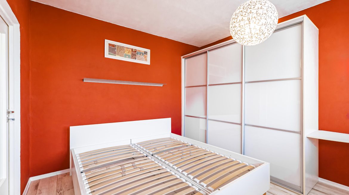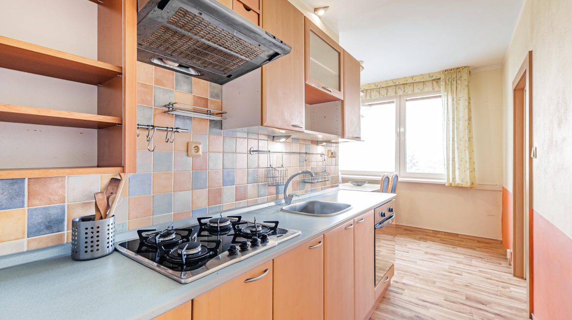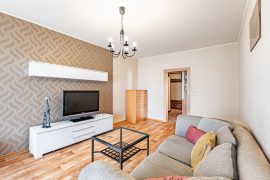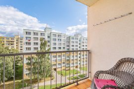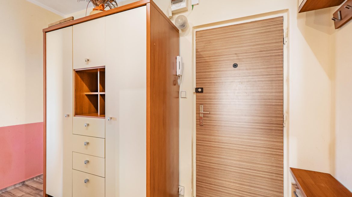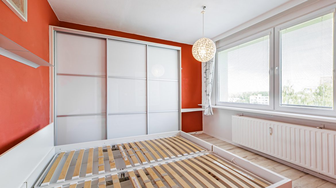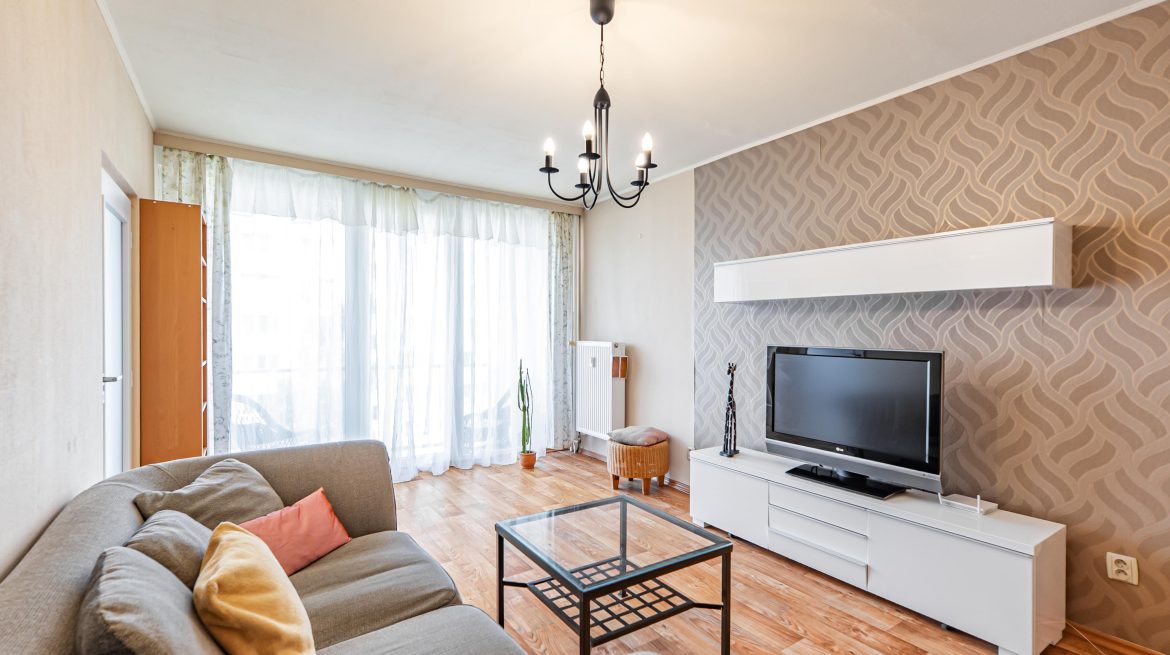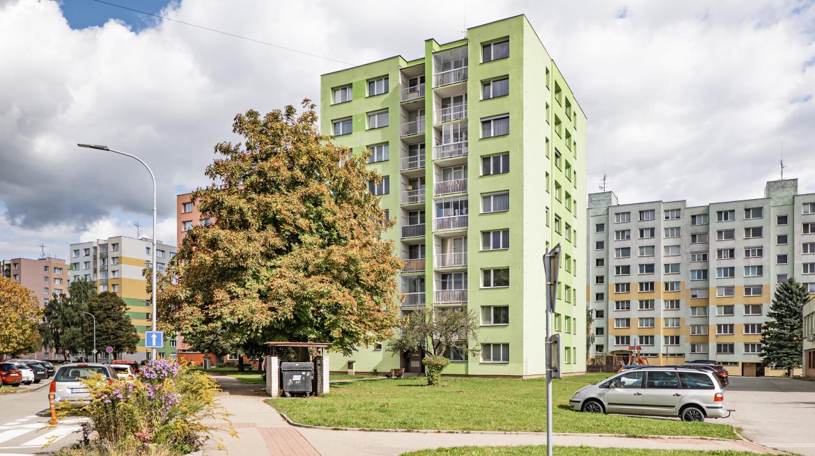 Byt se nachází v šestém patře (sedmém nadzemním podlaží) panelového domu s výtahem. Při vstupu do bytu se nacházíme ve větší předsíni (zádveří). Naproti nám je koupelna s toaletou. Z předsíně se můžeme vydat dále do kuchyně s jídelnou nebo do obývacího pokoje s prostornou lodžií. Díky velkým oknům je tato místnost přirozeně světlá, díky čemuž Vám dodá na pocitu svěžího bydlení. U obývacího pokoje se pak nachází hlavní ložnice. Druhý pokoj, který můžete využít jako další ložnici, pracovnu nebo místnost pro hosty, se pak nachází u jídelny. Kuchyně a pokoj u jídelny jsou orientovány na sever, zatímco obývací pokoj a hlavní ložnice na východ. Součástí pronájmu je ještě sklepní kóje v přízemí domu.