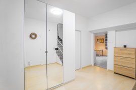Dispozičně se jedná o 1+1 s vlastní koupelnou a oddělenou toaletou. Jak již bylo řečeno, byt se nachází v prvním podlaží vily. Do té vstoupíte stejným vchodem jako majitelka nemovitosti, která bude obývat vrchní patra. Jedinými společnými částmi domu tak budou předsíň na odložení obuvi a dále větší chodba (12,35 m2), kterou však majitelka využije čistě pro průchod do svého vlastního bytu. Aktuálně je ještě v řešení oddělení schodiště od této chodby/místnosti dveřmi, aby byla zajištěna co největší míra soukromí pro všechny obyvatele objektu. Výhledově půjde o příští cca dva měsíce.